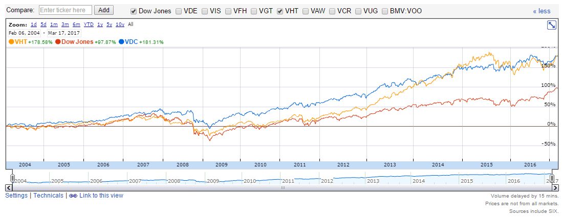 個別銘柄が怖いって方は、歴史的にVDCなど市場平均を超えてきた生活必需品セクターのETFでも良いと思います。黄色はヘルスケアセクターのVHT。