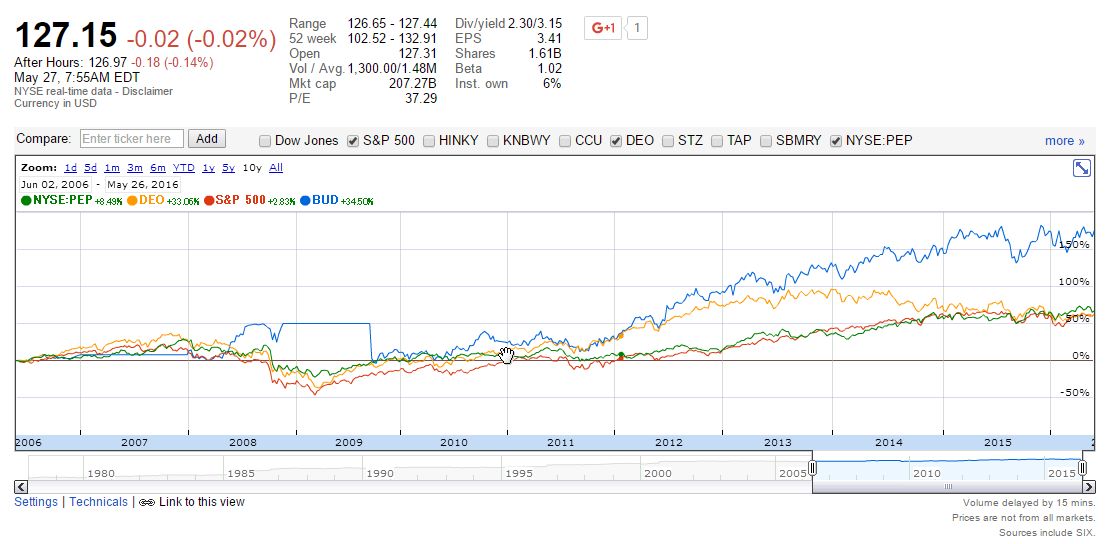 10年で177.86%UP、SP500をアウトパフォームしてますね。我が社、DEOも負けてます(笑)