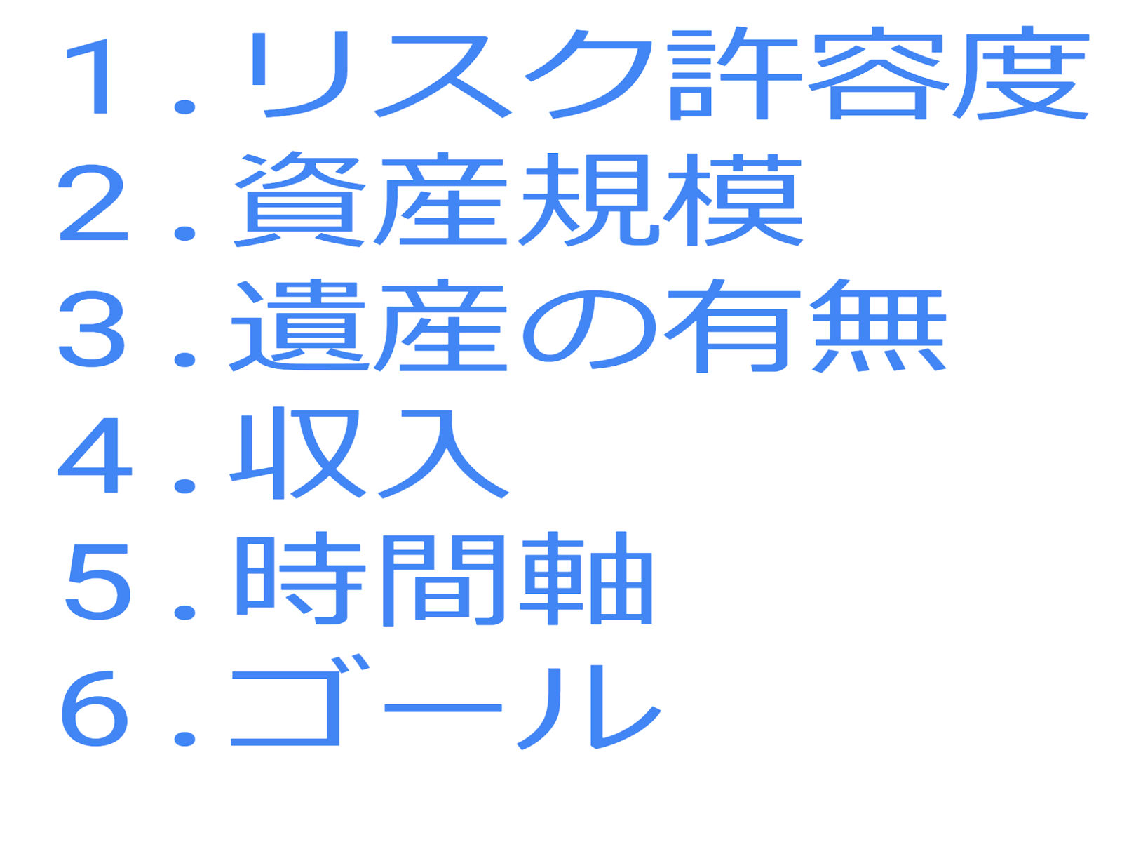 リスク許容度、資産規模、遺産の有無、収入、時間軸、ゴールと6つの投資ブログを