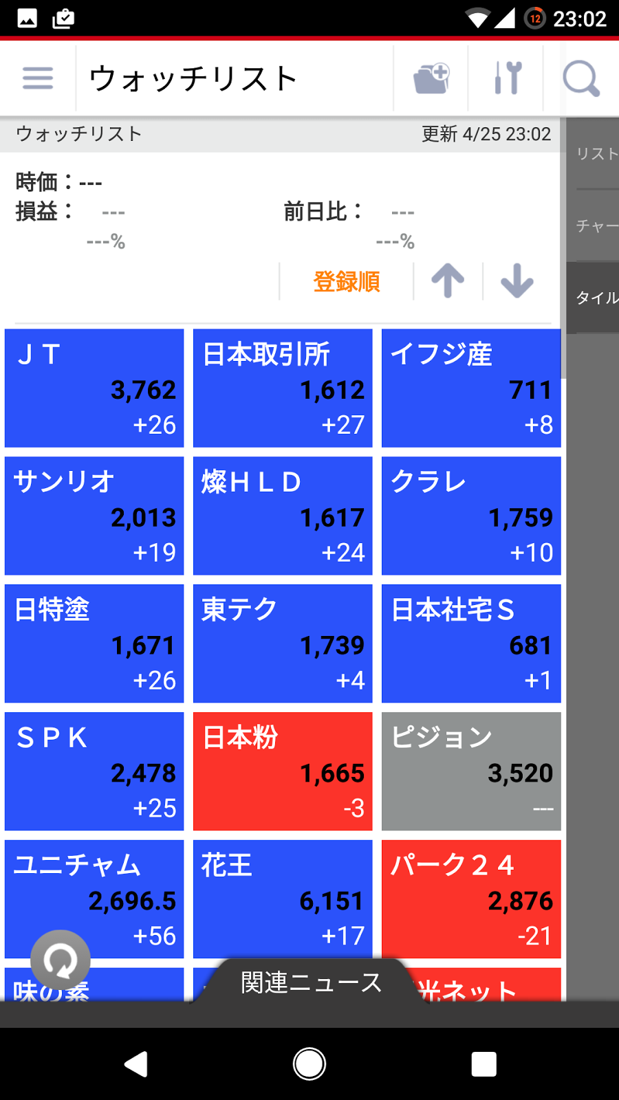 ウォッチリスト(チャート)と(タイル)の画面