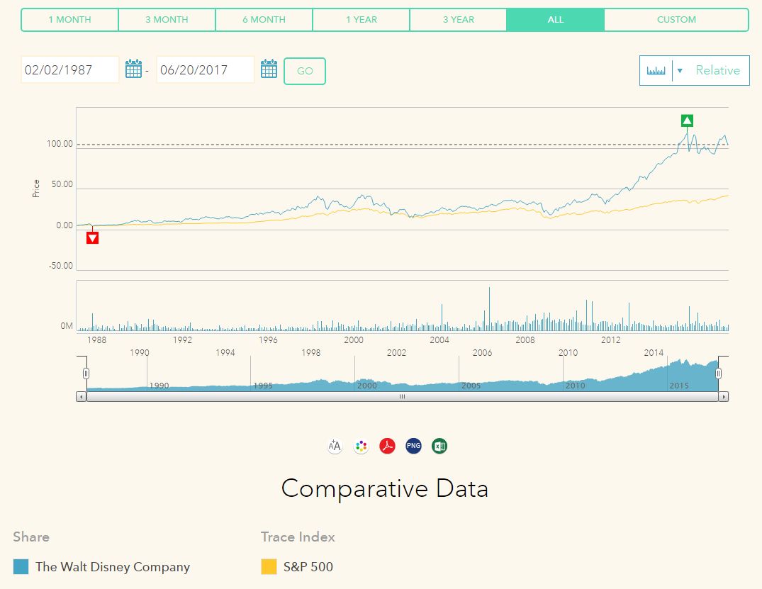Walt Disney CoのIRページを見たら、S&P500と比較できるツールがありました。自信あり、という感じがあって好感度アップしました。